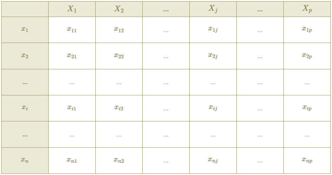 \[{\sf Random\ Vector:}\ \ \ \ \ \ \ \ {x_i} = {({x_{i1}}, ... , {x_{ip}})}^T,\ \ \ \ \ \ \ \ \ where\ \ i\ =\ \{1,2,...,n\} \qquad(2)\]